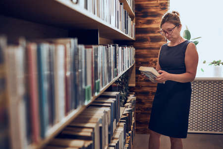 Woman reading book in public library. Searching for literature for reading and learning. Selecting books. Benefits of everyday reading. Books on shelves in bookstore