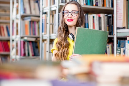 Horizontal image of brunette beautiful girl with books in library