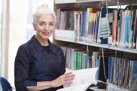 Portrait of smiling mature female student reading a book in the library