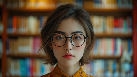 Portrait of young woman in glasses standing in front of bookshelves