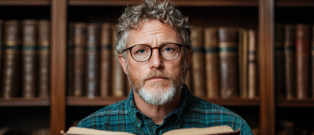 mature man with glasses reading book in library