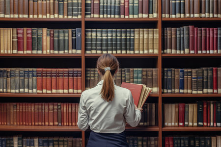 In a quiet library, a young woman with glasses stands between stacks of books, deeply focused on her reading. The warm ambiance enhances her concentration on the pages.