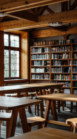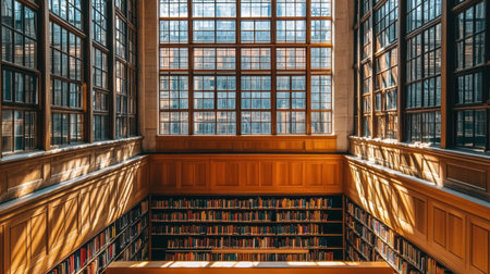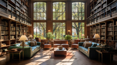 A beautifully designed library interior showcasing large windows that invite sunlight, illuminating wooden shelves filled with books for a serene study atmosphere.
