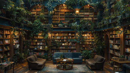 A serene reading area featuring expansive bookshelves filled with books, surrounded by lush indoor plants, designed for comfort and relaxation in a warm atmosphere.
