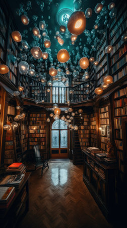 A tranquil library with soaring bookshelves, a glowing chandelier, and people quietly immersed in reading. The peaceful and elegant setting inspires learning and introspection.