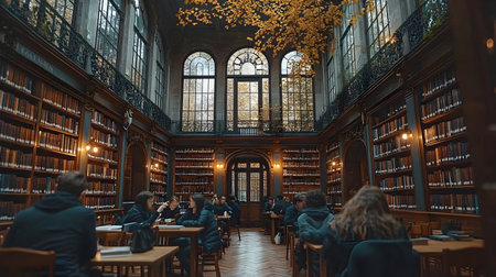 Students sit at tables in a grand library hall, studying among bookshelves. The image features warm lighting, dark wood, and a high ceiling.