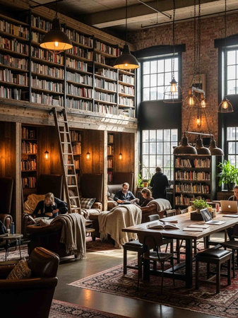 Cozy bookstore cafe invites patrons to relax, read, and connect amidst shelves of knowledge