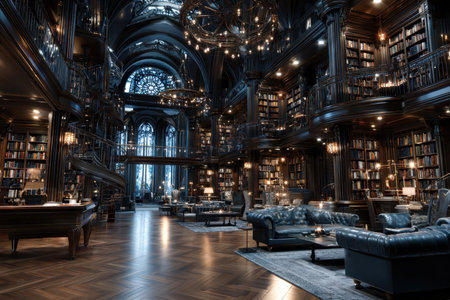 Dark, ornate library interior with bookshelves, comfortable seating, and atmospheric lighting