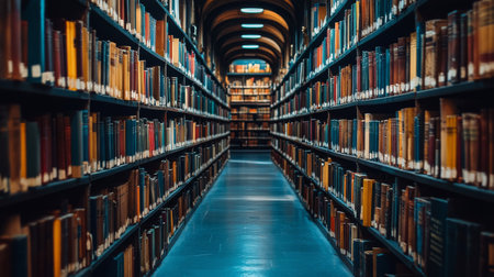 A large library filled with rows of books stretching as far as the eye can see, showing a vast collection of literature and knowledge.