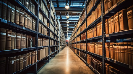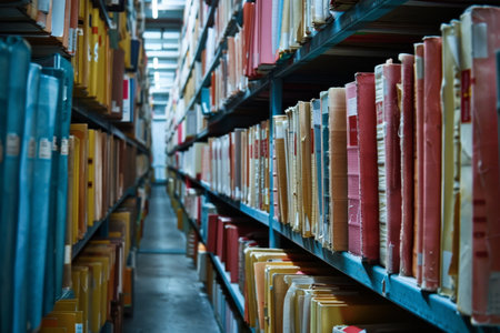Rows of organized files in a modern archive, focused perspective view.