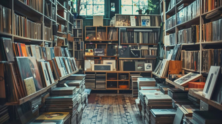 Vinyl records line the shelves of a nostalgic record store, with soft, warm lighting giving the space a retro feel.