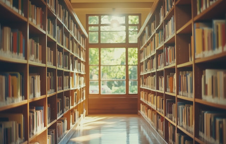 Explore an inviting library with rows of books bathed in sunlight, perfect for study, research, or adding a touch of intellectual charm to your projects