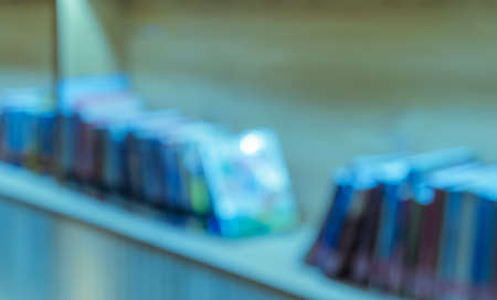Blurred abstract background of book shelve in public library. Vintage filter effect image