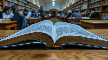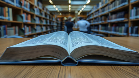 Open book on a wooden table in the library with blurred people in the background