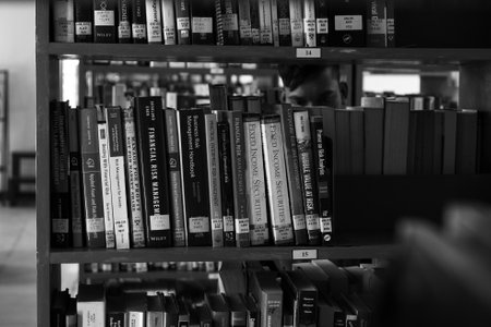 Books in a library. Black and white image. Selective focus.