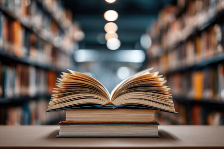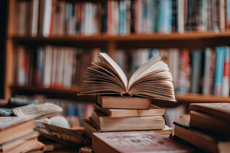 An open book rests atop a stack of two books, capturing attention with its inviting pages. The image showcases soft focus on bookshelves in the background. The warm lighting contributes to the inviting atmosphere, and the composition evokes concepts of learning, education, and knowledge within an indoor setting. Suitable for educational and commercial content.