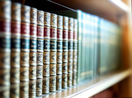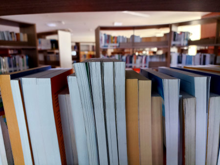 Bookshelf with books in the library, shallow depth of field