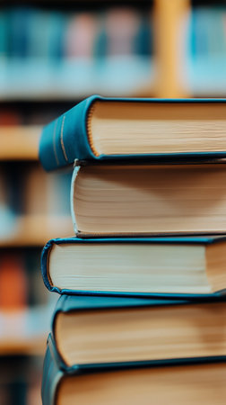 A close-up view of several stacked books with vibrant covers in a library. Shelves filled with other books are visible in the background, creating a warm atmosphere for reading.