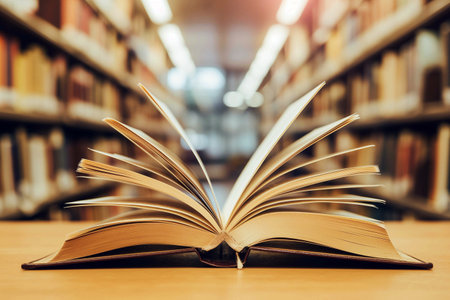 Open book on a wooden table in a library. Education background.
