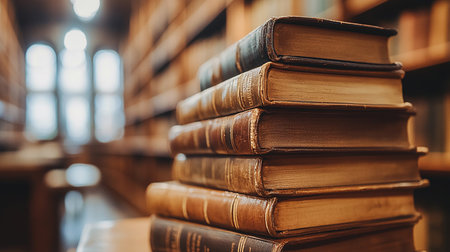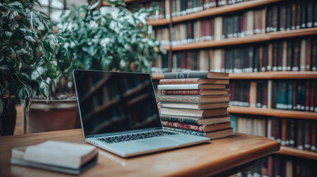 Cozy library interior with stacks of books and a laptop on a wooden table, capturing a scholarly, academic atmosphere ideal for education and research themes.