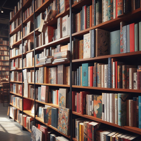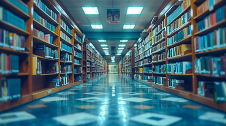 A captivating view of a library interior showcasing neatly arranged bookshelves filled with colorful books, providing a quiet space for studying and reading in a vibrant atmosphere.