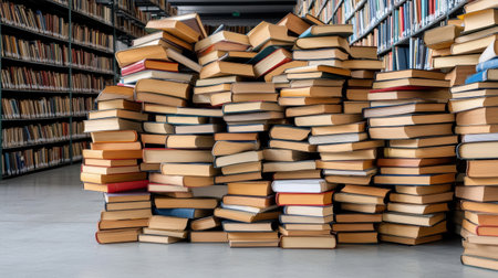 A Piles of books stacked in library, showcasing love for reading