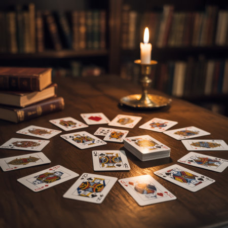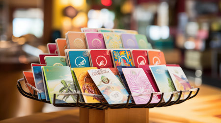 A collection of playing cards spread out on a table with various suits and values, Rows of romantic greeting cards displayed in a quaint stationery shop, AI Generated