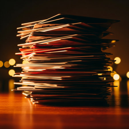 A business professional carefully organizes index cards in a dimly lit office, emphasizing attention to detail and effective information management techniques.