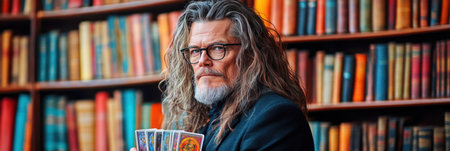 A middle aged man with long hair stands confidently in front of a towering bookshelf filled with colorful books. He holds tarot cards in his hands ready for a reading.