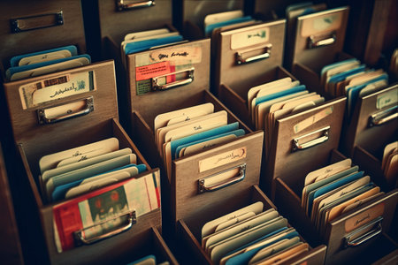 A close-up view of a vintage wooden filing cabinet with colorful file cards. This image showcases an organized system of records, highlighting the charm of traditional paperwork.