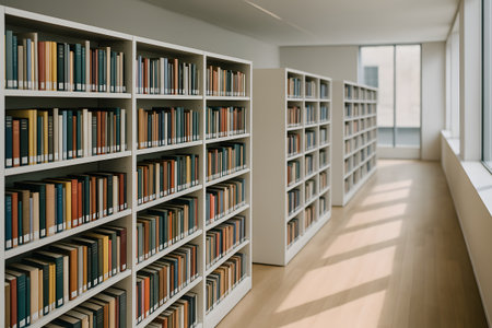 Neatly arranged books line the shelves of a tranquil library, creating a serene atmosphere perfect for study and reflection