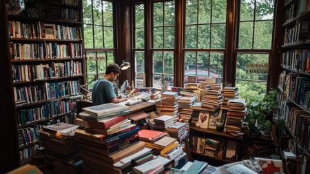 A tranquil reading nook filled with stacks of books in a warm, inviting library. Sunlight streams through the windows, creating a perfect study environment.