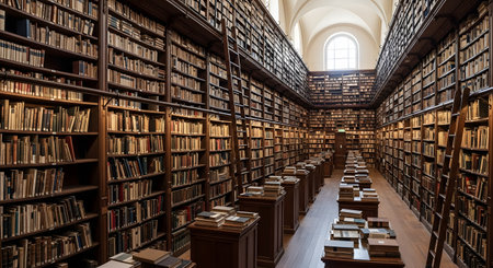 A large library filled with rows of books stretching as far as the eye can see, showing a vast collection of literature and knowledge.