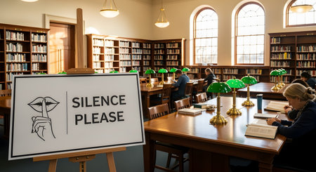 A 'SILENCE PLEASE' sign on an easel stands in the foreground of a quiet, traditional library. In the background, students study at wooden tables equipped with classic green banker's lamps, with bookshelves lining the walls.