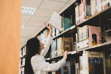 Young Asian women are searching for books and reading books on the tables and aisles of the college libraries to research and develop their academic and education self.