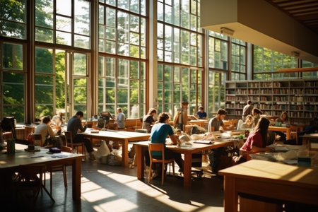 Defocused background image of a busy library with students tered across tables and desks absorbed in their books and research materials. The shelves of books in the background add