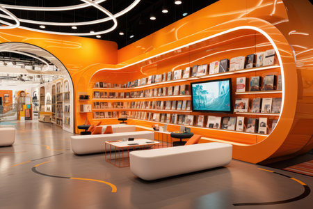 A modern bookstore with a sleek design, showcasing a wide selection of books on minimalist shelves under dramatic lighting.. AI Generation
