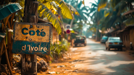 Country road in Sri Lanka with road sign and coconut palm trees.