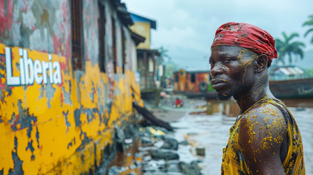 A weathered building with the word 'Liberia' stretches along a littered coastal shore, under a bright sky, flanked by palm trees and the ocean.
