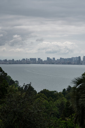 Tropical city landscape after hard rain and storm. Travel and vacation concept. Weather and nature idea. With copy space.