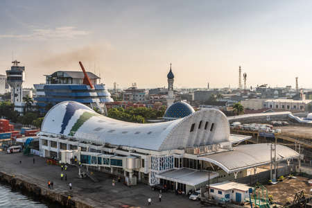 Makassar, Sulawesi, Indonesia - February 28, 2019: Early morning view on cruise ship terminal with Masjid Babulssalam Pelabuhan mosque and city skyline.