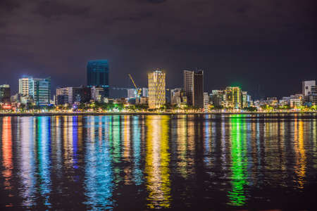 Night on Da Nang waterfront, lit tree with hearts. Dragon River Bridge over Han River, Cau Rong Rong Bridge in Da Nang, Vietnam
