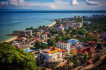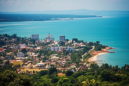This vibrant aerial image captures Dar es Salaam's scenic waterfront showcasing unique architecture, busy streets, palm trees, and boats on the harbor.