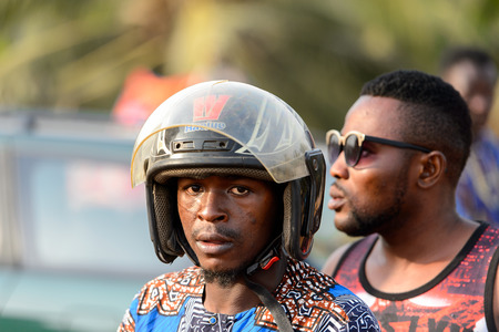 OUIDAH, BENIN - Jan 10, 2017: Unidentified Beninese man in helmet at the local market. Benin people suffer of poverty due to the bad economy