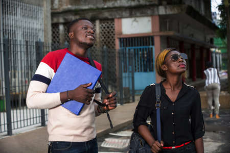 portrait of a beautiful young couple in love smiling outdoors on the street.