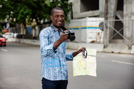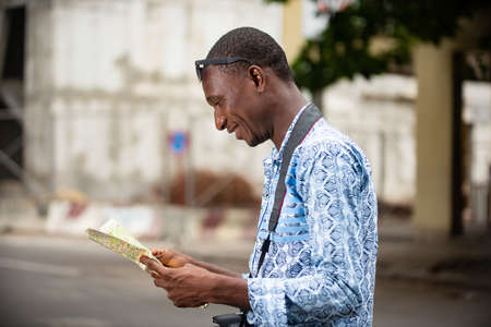 Unidentified Guinean man in orange shirt walks along the street of Guinea.
