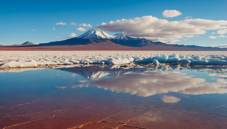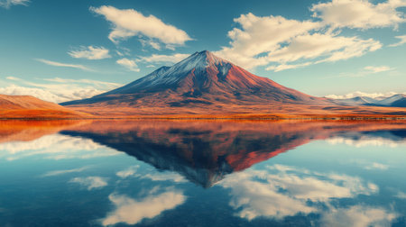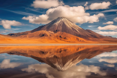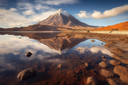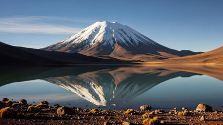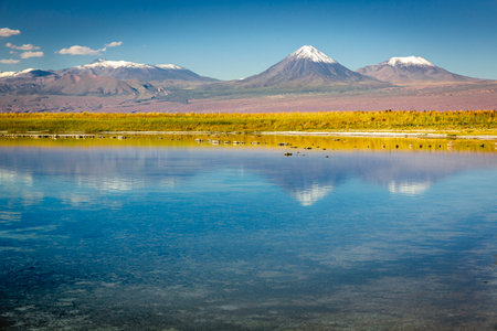 Stunning reflection of a snow capped mountain in a perfectly still lake in the Atacama Desert, Chile, creating a breathtaking natural mirror