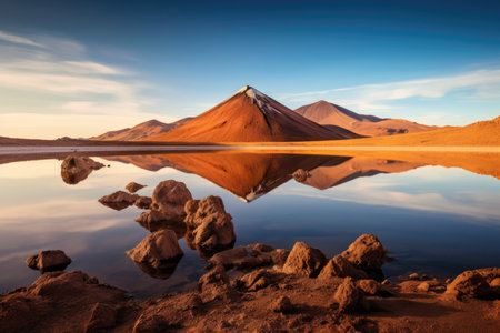 This breathtaking photo captures the idyllic Lake Lejia with its reflection and stunning volcanic landscape in the Atacama desert of Northern Chile, South America. The crystal clear water of the lake reflects the majestic mountains and the blue sky, creating a serene and tranquil atmosphere. This image is perfect for nature lovers, travel enthusiasts, and those who appreciate the beauty of our planet.