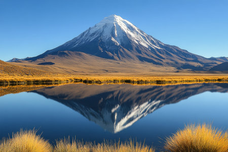 A stunning snow-capped mountain towers over a serene lake, its reflection mirrored perfectly on the calm water under a clear, blue sky. Golden grasses frame the scene.