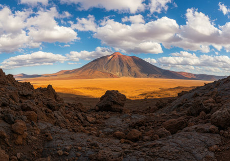 A vast, arid landscape with a prominent volcano in the distance, framed by rugged volcanic rock formations in the foreground.